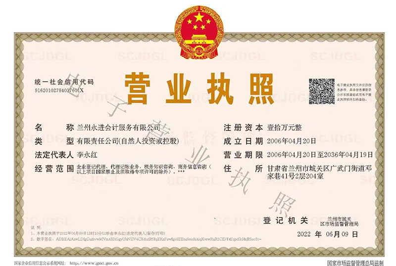 蘭州永進會計服務有限公司(Lanzhou Yongjin Accounting Service Co., Ltd.)成立于2006年04月20日,注冊地位于蘭州市城關區(qū)廣武門街道鄧家巷41號2層204室,法定代表人為李永紅。經(jīng)營范圍包括企業(yè)登記代理、代理記帳業(yè)務、稅務知識咨詢、商務信息咨詢等。至今已為多家企業(yè)提供了包括公司注冊、驗資、增資、審計、評估、網(wǎng)上年檢、資質(zhì)認證、一般納稅人認定、代理做賬、納稅申報在內(nèi)的系統(tǒng)服務。企業(yè)登記注冊(營業(yè)執(zhí)照、組織機構(gòu)代碼證、國地稅登記證辦理),以及企業(yè)成立開業(yè)后變更、轉(zhuǎn)讓、納稅申報、財務做賬代理、商標注冊代理、企業(yè)年度審計、年檢、注銷、歇業(yè)、辦理分支機構(gòu)等后續(xù)一站式服務。